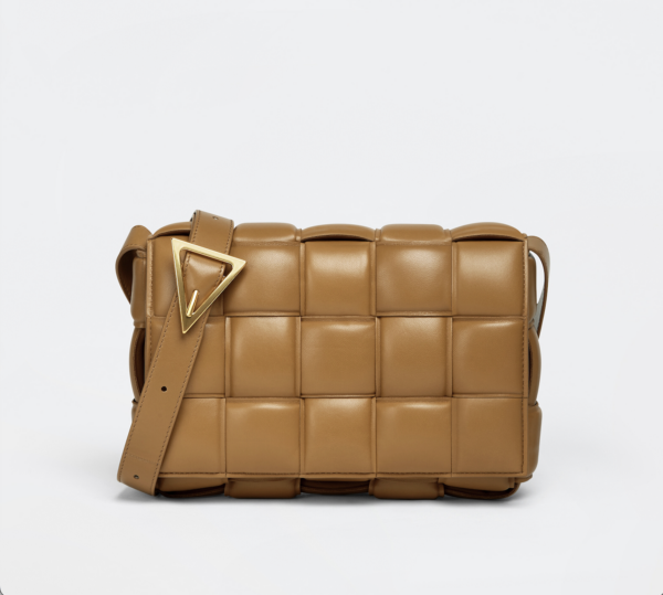 A padded woven genuine leather crossbody with chunky gold chained handle detail.