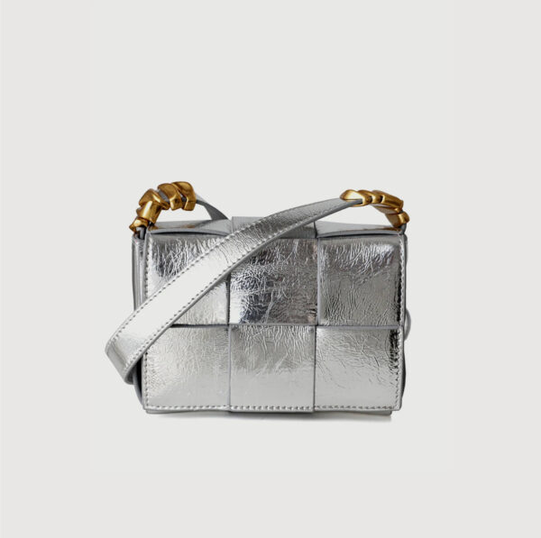 A padded woven genuine leather crossbody with chunky silver chain.